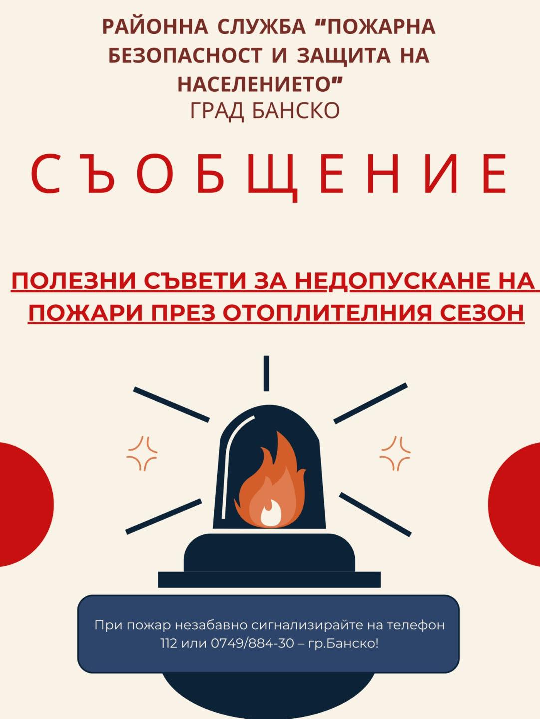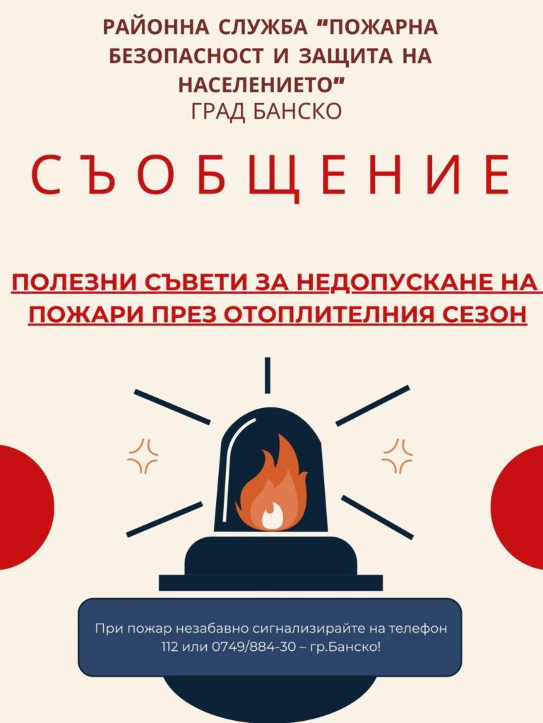 Районната служба „Пожарна безопасност и защита на населението“ в Банско предупреждава жителите и гостите на общината за увеличения риск от битови пожари през есенно-зимния сезон. Най-честите причини за пожари са неправилното използване на отоплителни уреди, технически неизправности и непочистени комини.
