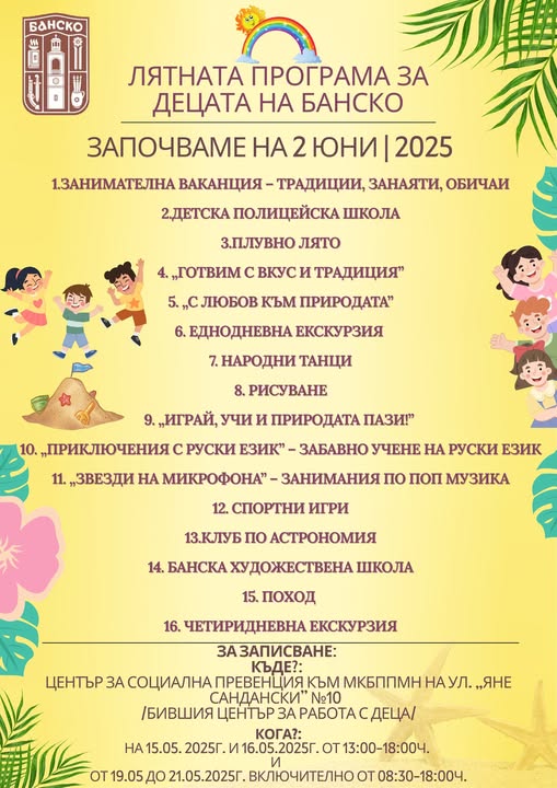 Община Банско обяви началото на лятната програма за деца, която включва разнообразни активности и събития, съобразени с интересите и нуждите на малките участници. Програмата ще предложи възможности за участие в различни културни, образователни и спортни мероприятия.